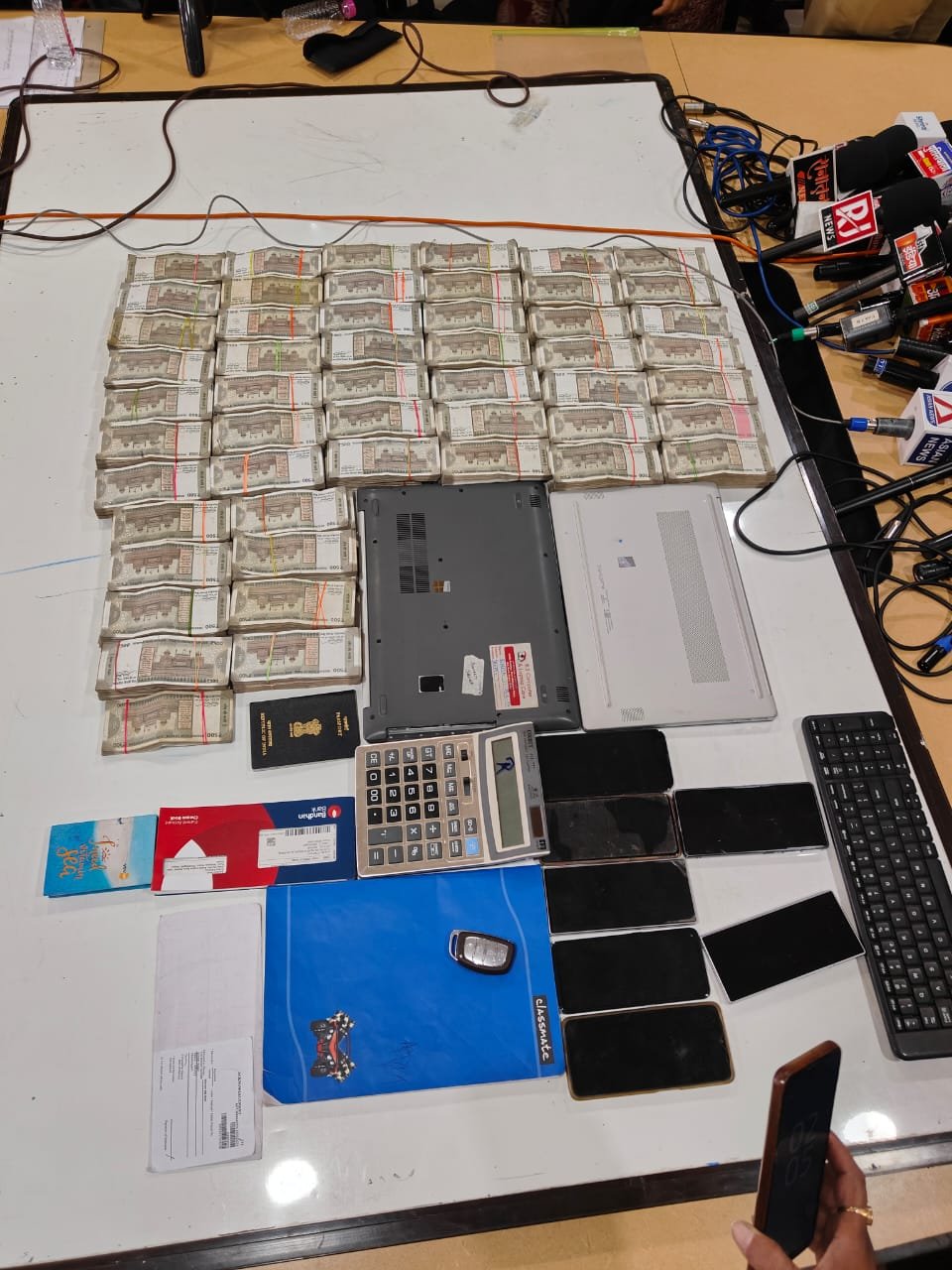 02 लैपटॉप, 10 मोबाइल फोन, हुंडई टक्सन कार, पासपोर्ट, एटीएम कार्ड, चेकबुक, केलकुलेटर जप्त।